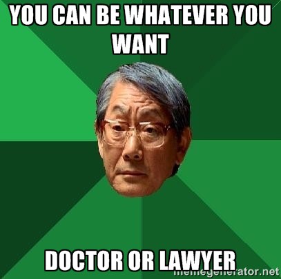 As with a lot of funny-but-mildly-offensive memes, High Expectations Asian Father has a kernel of truth to it. I saw a variation: “You can learn whatever musical instrument you want: Violin or Piano.”
