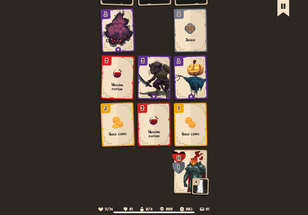 In Forward: Escape the Fold, you advance through a dungeon by moving your character onto one of three cards in front of you. Cards can represent enemies, health items, treasure chests, poison, and more. As you progress through the thirteen levels of the dungeon, you’ll accumulate power-ups; these can interact and stack on top of each other, so that by the end of the dungeon, they can be very powerful.