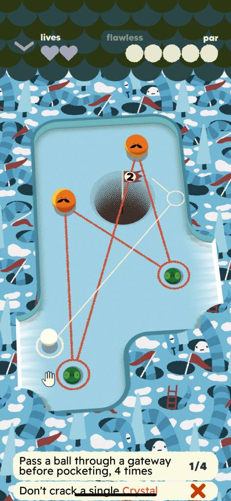 In some ways, Subpar Pool doesn’t care about skill. Nothing bad happens if your white ball ends up in a pocket; it just removes the “flawless” status from that table, which usually doesn’t mean anything. In fact, it can be useful to pocket yourself as you get to freely place the white ball again. Similarly, while each table has a different par number, representing how many shots you have to clear it, here’s what would happen if a table had a par of 3 and you: