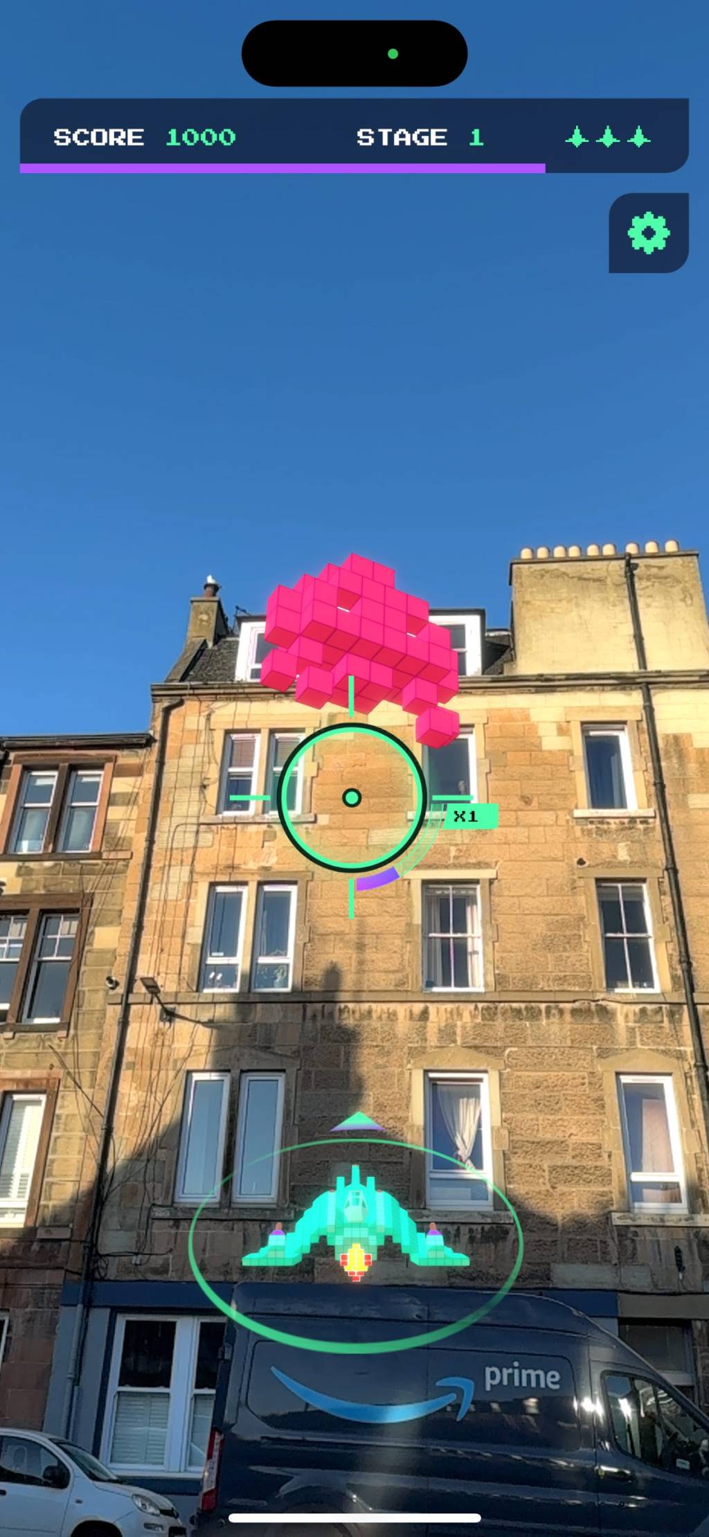 My spaceship, previously stationary at the bottom of the screen, took off and flew on rails over the equally blocky neighbourhood toward groups of aliens. I found this slightly more interesting because there was now more than one alien at a time to shoot at; I also appreciated not having to hold my phone up. Sadly, after a minute I was returned to the real world, and the cycle repeated until I got hit by one yellow cube too many.