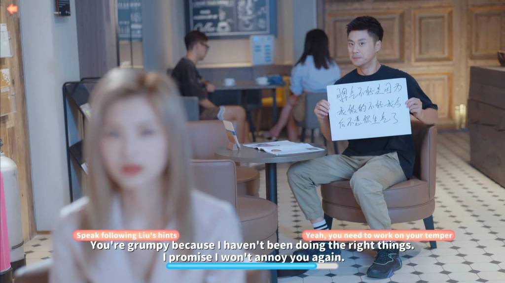 During the remainder of the first chapter, you find your lost phone at the cocktail bar from an irate waitress, Xiao Lu; reply to text messages; look for a new flat with your buddy Liu (“I’m working to consolidate real estate resources. OK, I’m an estate agent.”); and meet an army of prospective roommates. This takes around 20-30 minutes.