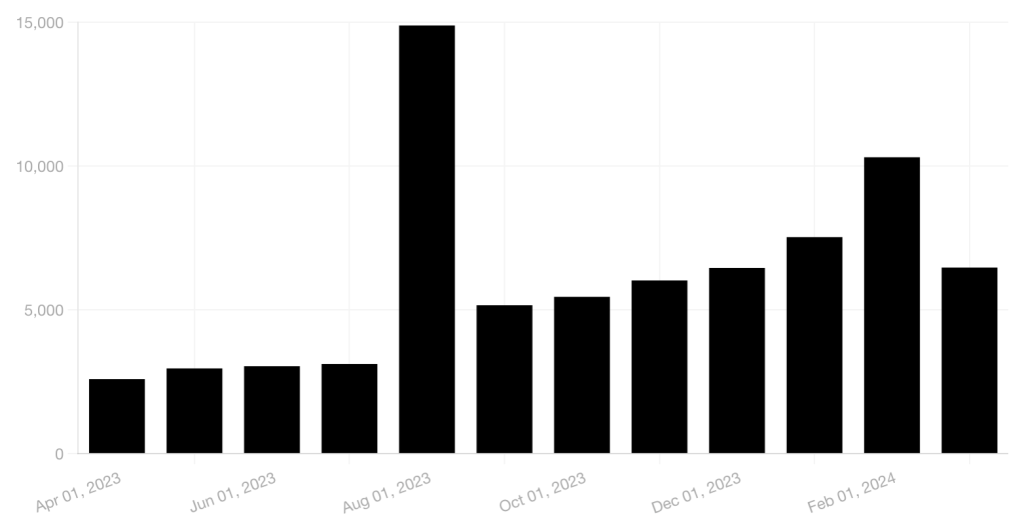 Overall view of my Substack newsletter climbed steadily over time. The peak in August is for the Star Wars post, which got a lot of attention and links, and February is when The Exit 8 started doing the numbers. I’m sure this month will be lower.